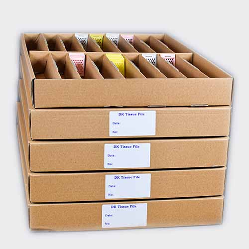 A cost-effective and lightweight cardboard tissue block archive box provides organized and secure storage for paraffin-embedded tissue blocks in pathology laboratories, featuring multiple compartments and clear labeling areas for easy sample retrieval.